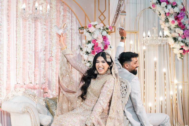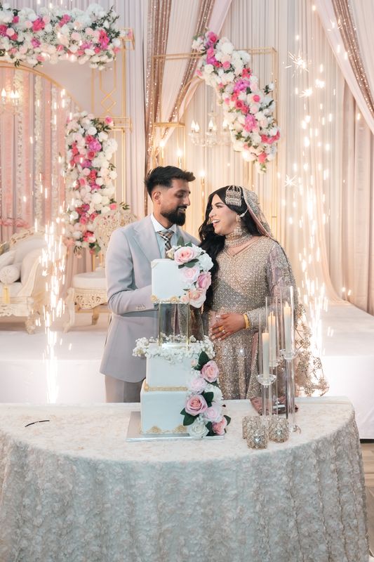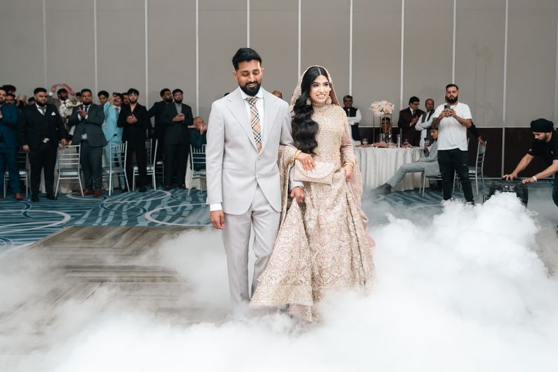 For their grand Pakistani wedding reception in Mississauga, Sana & Khizar chose Versailles Convention Centre, known for its luxurious ballroom and elegant chandeliers. The venue was transformed into a regal setting with opulent floral arrangements, stunning décor, and dazzling lights, creating a dream Pakistani wedding reception atmosphere.
